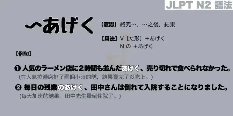 主頁 » 文法 » 【N2 文法】〜あげく(意思・用法・例句)【N2 文法】〜あげく(意思・用法・例句) 終究…,…之後,結果 (経過・結末) V[た形]+あげくN の +あげく 備註: 後接不好的結果! ① 人気(にん き )のラーメン店(てん)に2時間( じ かん)も並(なら)んだあげく、売(う)り切(き)れで食(た)べられなかった。在人氣拉麵店排了兩個小時的隊,結果賣完了沒吃上。 ② 彼(かれ)と口ゲンカを繰(く)り返(かえ)したあげく、別(わか)れることになった。與他多次爭吵後,我們分手了。 ③ 毎日(まい にち)の残業( ざん ぎょう)のあげく、田中( た なか)さんは倒(たお)れて入院(にゅう いん )することになりました。每天加班的結果,田中先生暈倒住院了。 類似文法: ・「〜結果」・「〜末に」 Post Views: 2,729 發佈留言 取消回覆發佈留言必須填寫的電子郵件地址不會公開。 必填欄位標示為 *顯示名稱 * 電子郵件地址 * 個人網站網址 留言 * 在瀏覽器中儲存顯示名稱、電子郵件地址及個人網站網址,以供下次發佈留言時使用。
